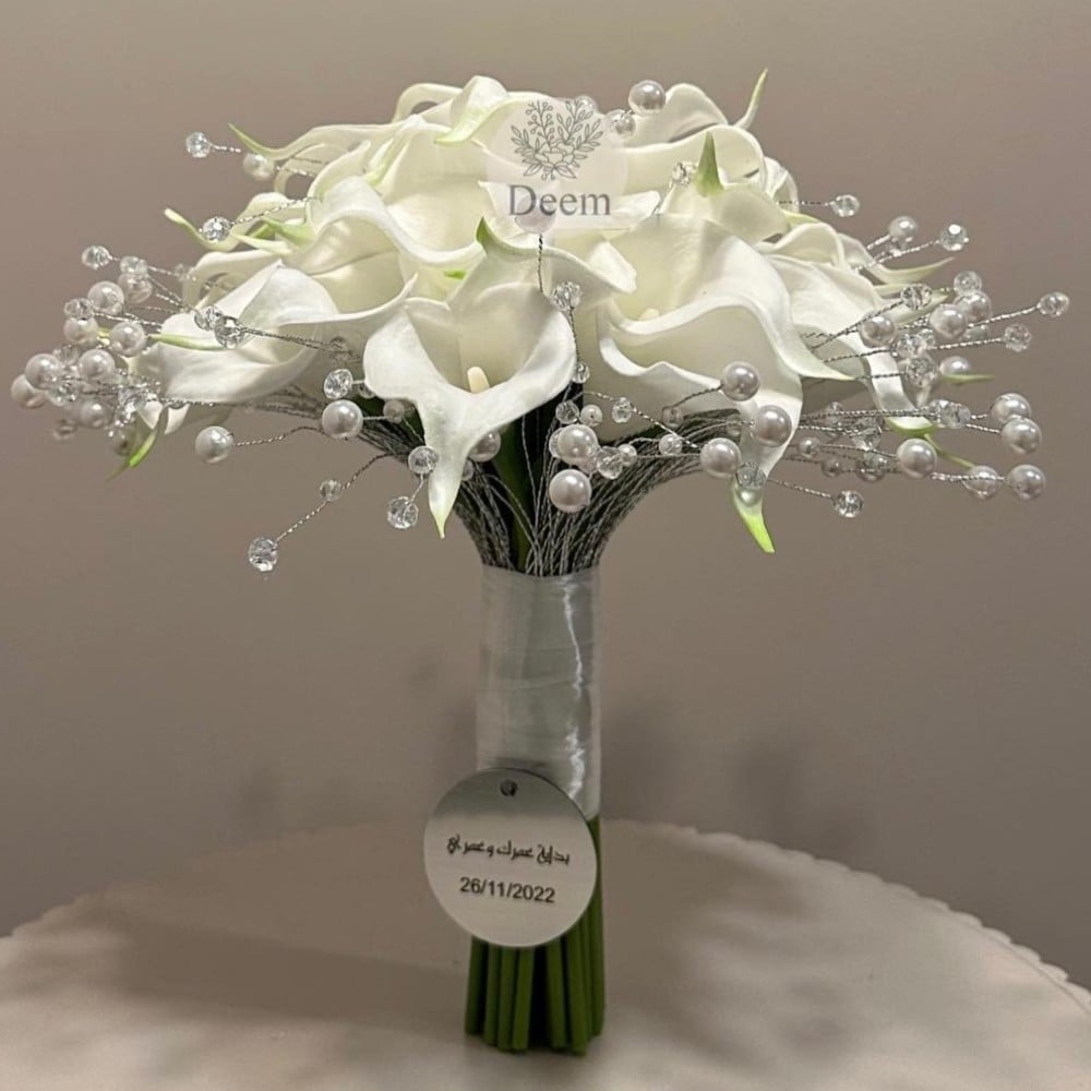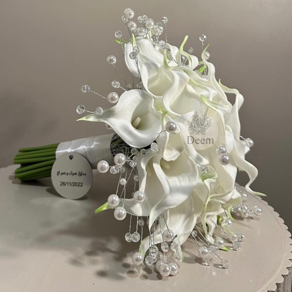 مسكة من ورد الكالا الشبيه للطبيعي محاط بالؤلؤ والبلور.